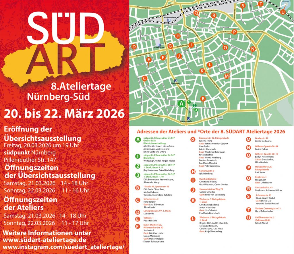 Wir möchten Sie/ Euch herzlich zu den 8. SÜDART-Ateliertagen vom 20.03.2026 bis 22.03.2026 einladen und würden uns sehr freuen, Sie/ Euch bei der Vernissage am Freitag, den 20.03. um 19:00 Uhr im Südpunkt sowie am 21.03.2026 und am 22.03.2026 bei uns im Atelier Kunst-Studio-Süd begrüßen zu können.